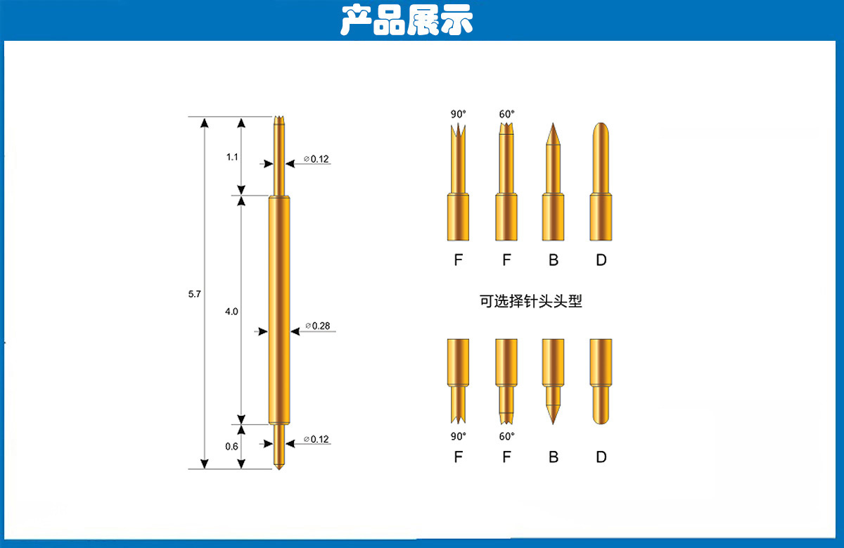 產(chǎn)品頭型:探針外徑為0.28mm,總長度為5.7mm、針的兩端的頭型分為尖頭、爪頭