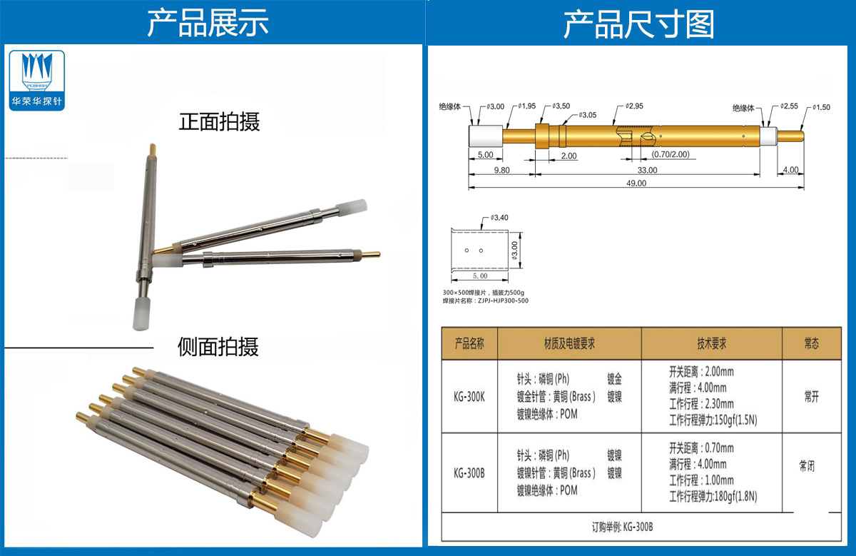 產品介紹:本產品一般用有定向作用的結束測試用,產品選用日本SK4 彈簧選用的是琴鋼線。工廠選用的材質都是比較硬的,有利于在測試的時候過大電流不會容易損壞。